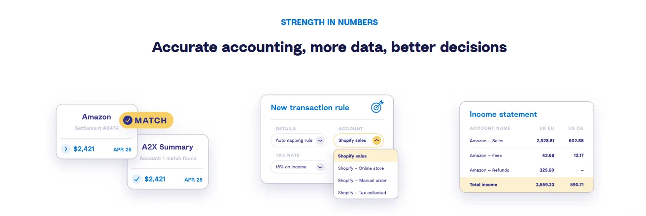 A2X has been a trusted solution in this space for years. It’s widely used by accountants and larger sellers for its consistency and accuracy, particularly across major marketplaces such as Amazon and Shopify. Its approach focuses on reliability and data integrity - producing clean journal entries that match settlement reports exactly.
