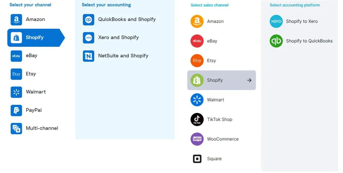 - A2X: Amazon, Shopify, eBay, Etsy, Walmart, BigCommerce, NetSuite, Xero, QuickBooks.