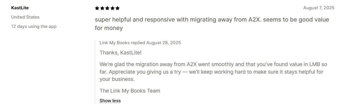 - Highly rated support: Reviews consistently highlight fast, knowledgeable support, often provided by accountants. On its own site, Link My Books shares examples of support responses arriving “within half an hour” even outside standard hours.