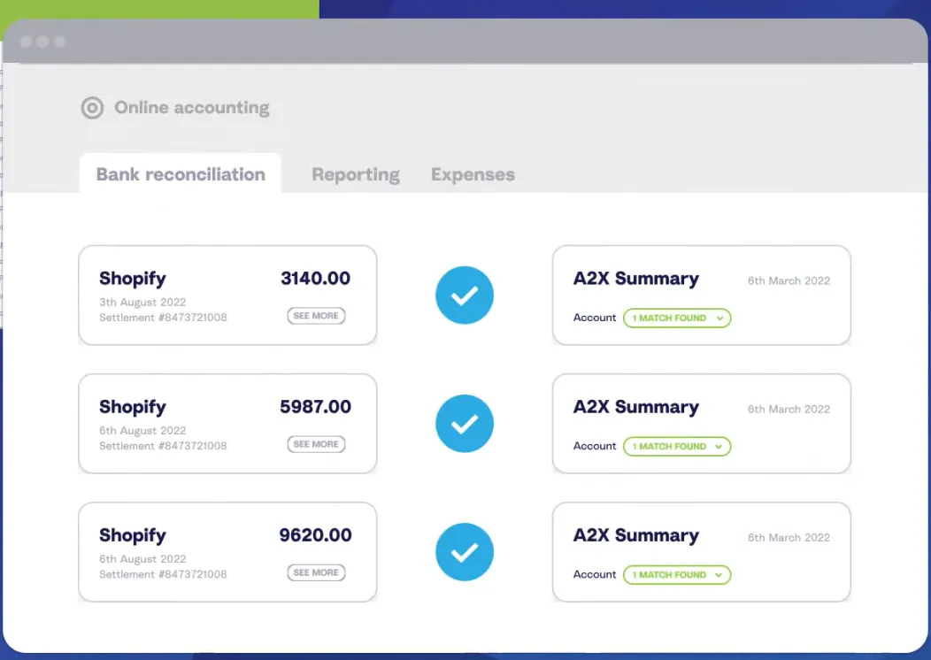- Get payout summaries that match your bank feed, so reconciliation is a one-click process.