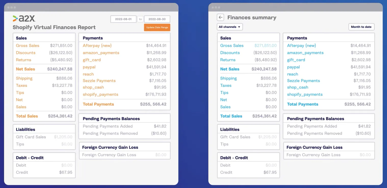 - A2X: Creates payout summaries for Shopify Payments that match deposits, but other gateways (like PayPal or Stripe) are routed through clearing accounts. Sellers then need to manually reconcile those balances once deposits arrive.