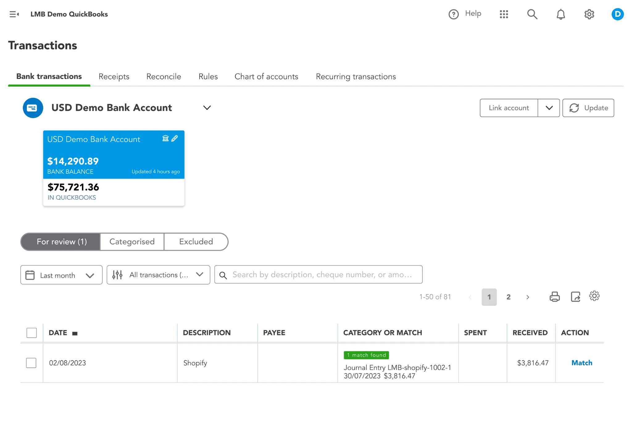Because of these limitations, many Shopify sellers with QuickBooks Online turn to dedicated tools like A2X or Link My Books, which create clean payout summaries that reconcile directly against bank deposits.