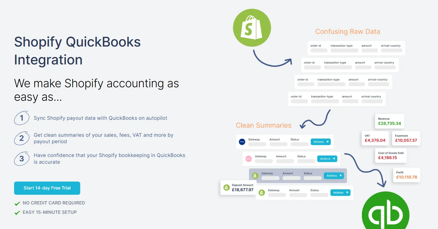QuickBooks offers a direct Shopify integration through its Connector app (formerly OneSaas). While it promises to sync orders and payouts automatically, many sellers report limitations that make accurate bookkeeping difficult: