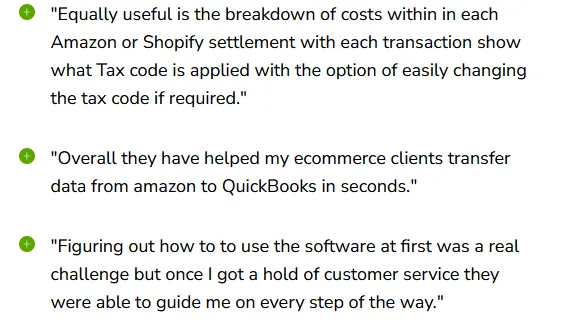 - “I love the one time set up and ease of integration into Xero and Amazon. I got my accountant to set up my tax mappings and I never need to worry about whether my Amazon transactions get imported into my Xero accounting software.” (Capterra)