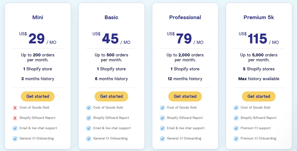 A2X prices its Shopify integration based on monthly order volume, not revenue. Each plan includes a defined order cap and a fixed amount of historical data. When your Shopify store exceeds those limits, you must move to a higher tier.
