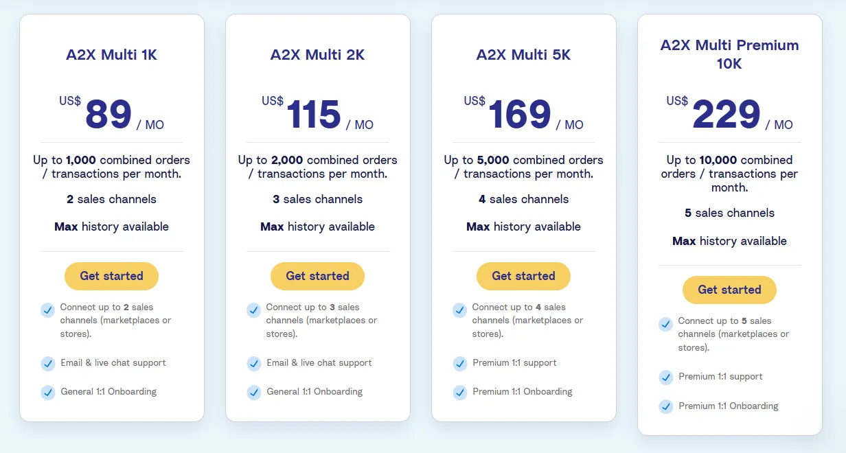 A2X publishes separate Multi-channel plans that price by “combined orders / transactions per month” and cap the number of sales channels you can connect. The Multi-channel pricing page shows fixed tiers and Premium tiers beyond the entry levels.