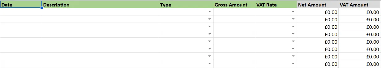 The spreadsheet will then calculate net and VAT amounts for you, giving you a clear, manual bookkeeping record.