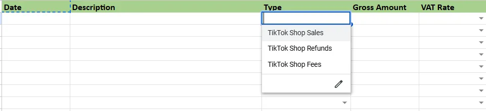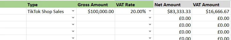 That’s why we’ve created a free TikTok Shop bookkeeping spreadsheet you can download and start using right away. It’s designed specifically for TikTok Shop sellers, with columns for sales, refunds, fees, and VAT, plus built-in formulas that calculate net and tax amounts automatically.