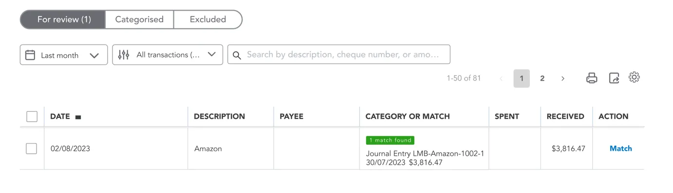 Each Amazon payout is imported, summarised, and matched to your QuickBooks bank feed automatically: