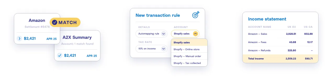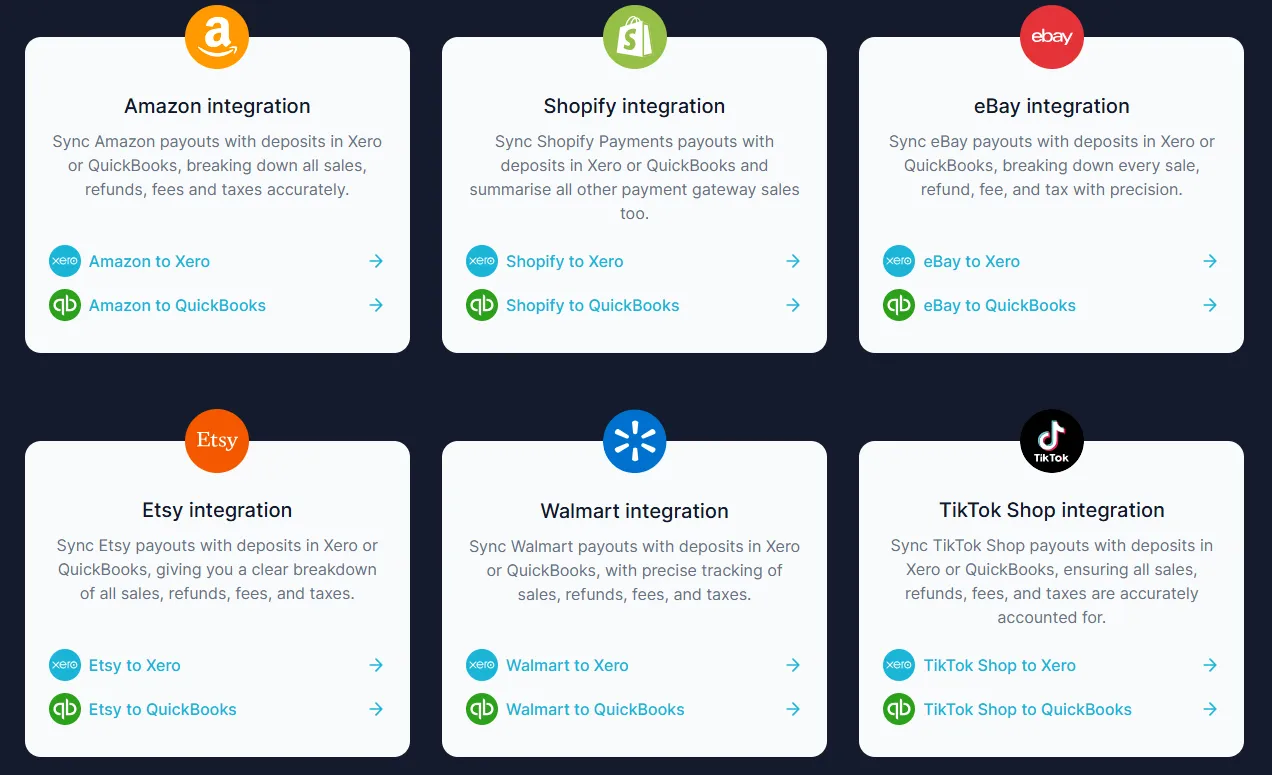 - Payout reconciliation: Sync sales, refunds, fees, and tax data from your sales channels into Xero or QuickBooks.