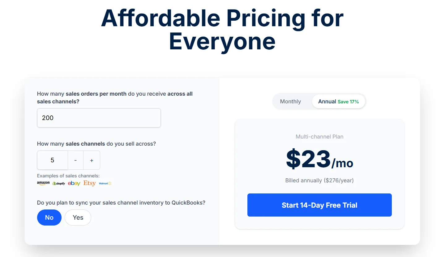 The pricing plans are flexible, and the price will change based on whether you sync your sales channel inventory to QuickBooks.