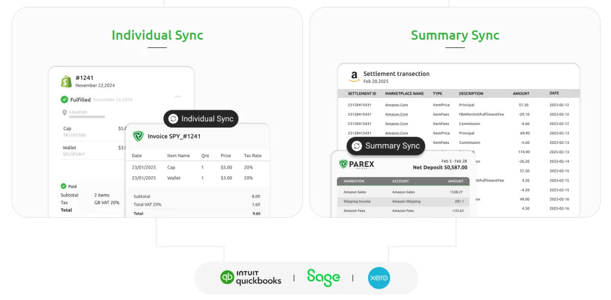 Parex Bridge is a lower-cost connector option that supports QuickBooks, Xero, and Sage, offers both individual sync and summary sync, and includes payout sync for easier reconciliation.