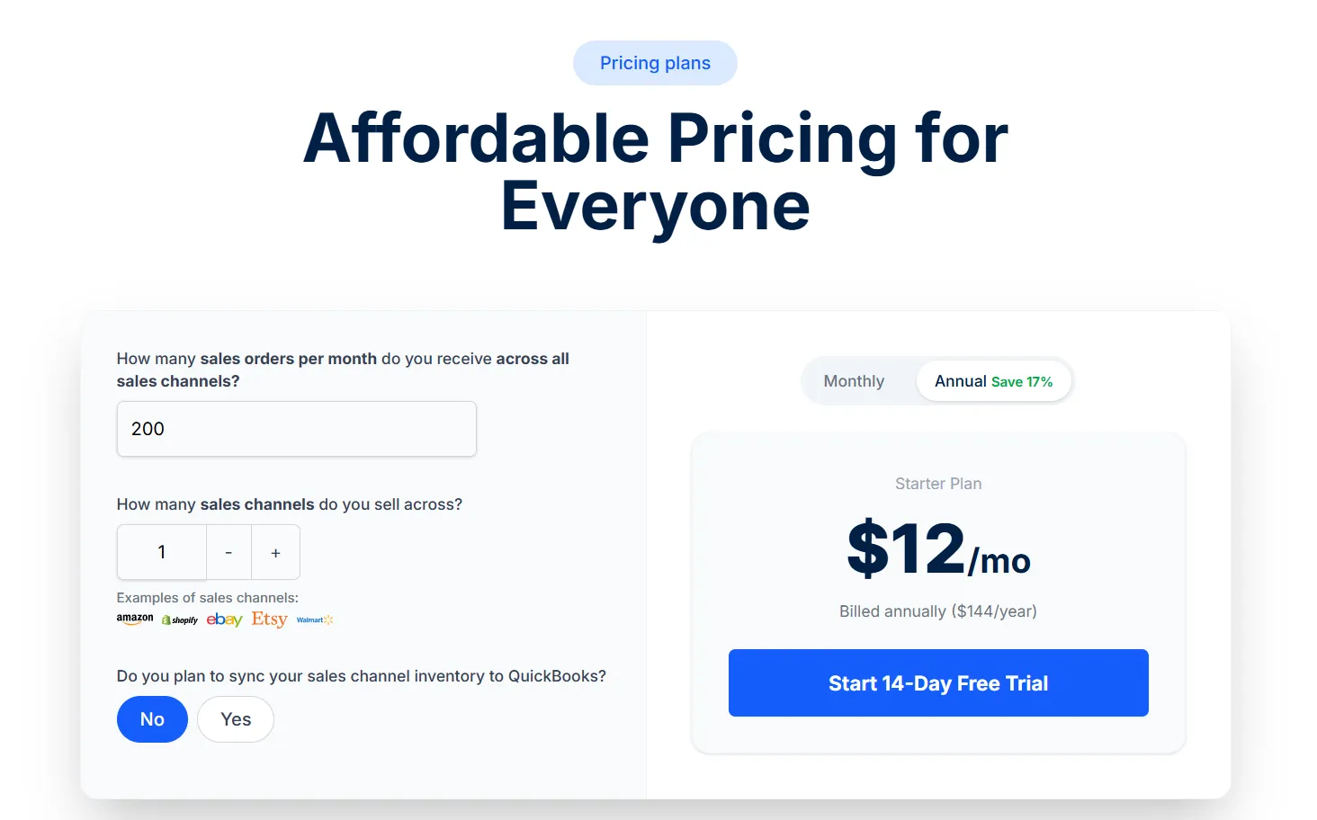 Taxomate does not use one flat fee for everyone. Its pricing changes based on order volume, channel setup, billing cycle, and whether you want its QuickBooks Inventory Sync workflow. Taxomate also states that it can auto-upgrade your plan when you go over your limit, which means the real cost can move with your business.