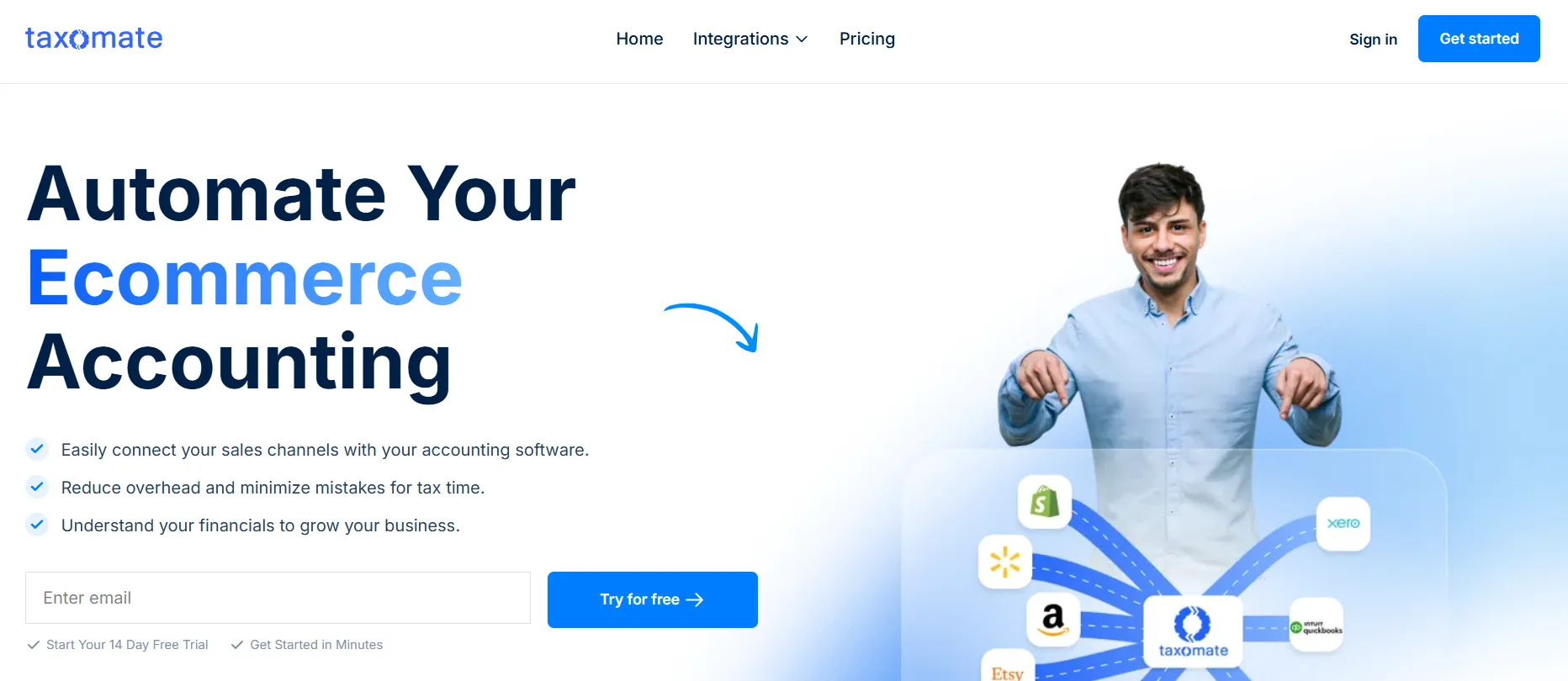 As supported sales channels. It also shows QuickBooks Online, Xero, and Wave as accounting integrations.
